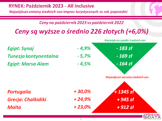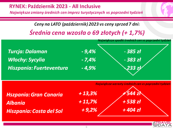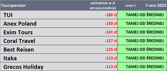Jak piszą autorzy raportu, którzy porównali ceny wyjazdów również w poszczególnych biurach podróży, porównując ceny z ostatniego roku, niższe średnie ceny miały w minionym tygodniu ETI, Prima Holiday, Itaka i Sun & Fun - o 1160 (sic!), 400, 90 i 40 złotych. Średnie ceny w pozostałych biurach podróży były wyższe niż przed rokiem w granicach od 230 złotych (TUI Poland) do około 660 złotych.
