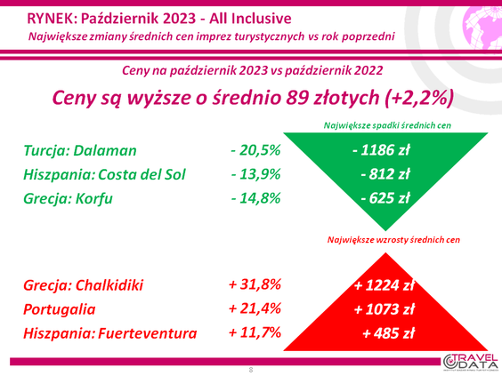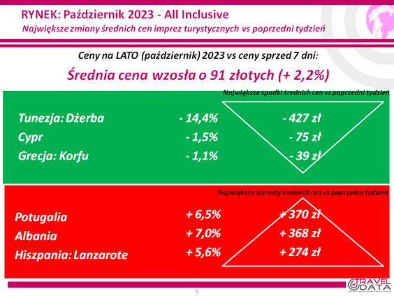 W ostatnim tygodniu średnia cena wycieczki z biurem podróży z wylotem między 2 a 8 października, wzrosła o 91 złotych – podaje w cotygodniowym raporcie z badania cen Instytut Badań Rynku Turystycznego Traveldata*. Był to drugi wzrost odnotowany przez Traveldatę dotyczący tej daty wyjazdów. Tydzień wcześniej wzrost wyniósł 69 złotych.