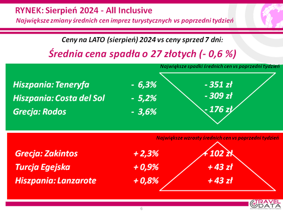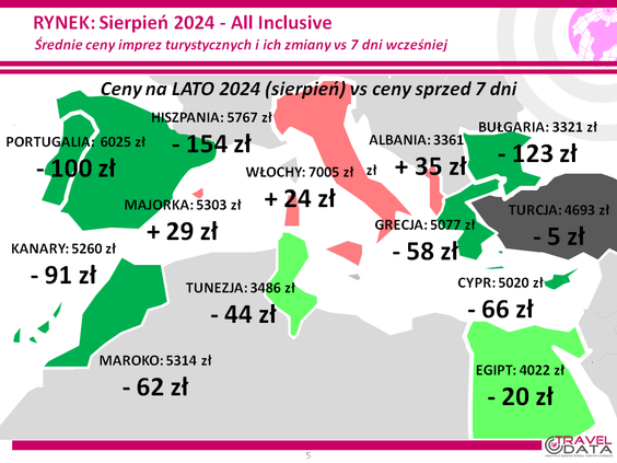 Porównanie przez Traveldatę dwóch średnich cen imprez turystycznych, z ostatniego tygodnia i sprzed roku, pokazało, że średnia tegoroczna była wyższa o 149 złotych. Przy czym najbardziej, licząc rok do roku, podrożały Sycylia (o 1543 złote), Malta (o 990 złotych) i Portugalia (o 700 złotych).