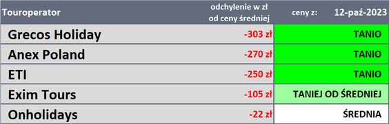 W minionym tygodniu spadły ceny wakacyjnych wycieczek do wszystkich pięciu najpopularniejszych kierunków, do Bułgarii o 123 złote, na Wyspy Kanaryjskie o 91 złotych, do Grecji o 58 złotych, do Egiptu o 20, a do Turcji - o 5 złotych.