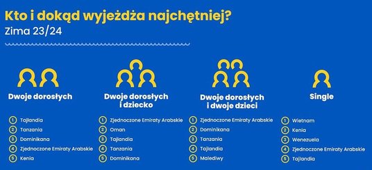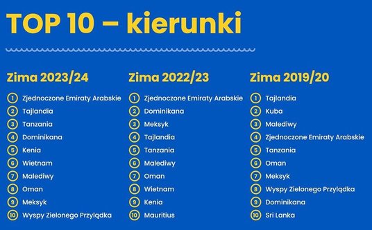 W pierwszej dziesiątce najpopularniejszych kierunków pojawia się w sumie pięć krajów azjatyckich. Poza ZEA i Tajlandią są to Wietnam, Malediwy i Oman. Afrykę reprezentują Zanzibar (Tanzania), Kenia i Wyspy Zielonego Przylądka. Zestawienie domykają Dominikana i karaibska części Meksyku. W tym roku do oferty weszły dwie nowości – wenezuelska wyspa Margarita i Wybrzeże Kokosowe w Brazylii.