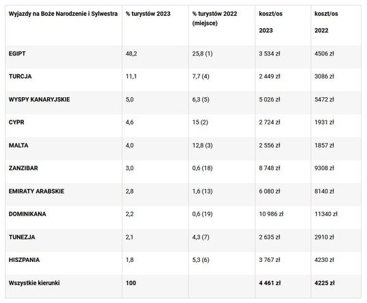 Ponad 10 procent klientów agenta wybiera się do Turcji. Za wypoczynek w tym kraju zapłacą średnio 2500 złotych (w 2022 roku było to prawie 3100 złotych). I znowu, to sporo drożej od najtańszych ofert w wariancie przelot, hotel czterogwiazdkowy i wyżywienie all inclusive, które kosztują już około 2000 złotych od osoby.