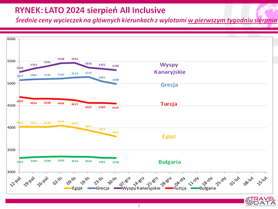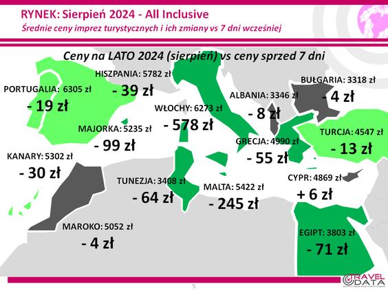 Średnia cena wycieczki z biurem podróży z wylotem między 5 a 11 sierpnia 2024 roku spadła w ostatnim tygodniu o 66 złotych – informuje w najnowszym raporcie Instytut Badań Rynku Turystycznego Traveldata*. To największy spadek od pięciu tygodni. Wcześniej ceny spadały o 33, 38 i dwa razy po 16 złotych.