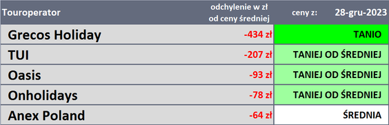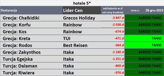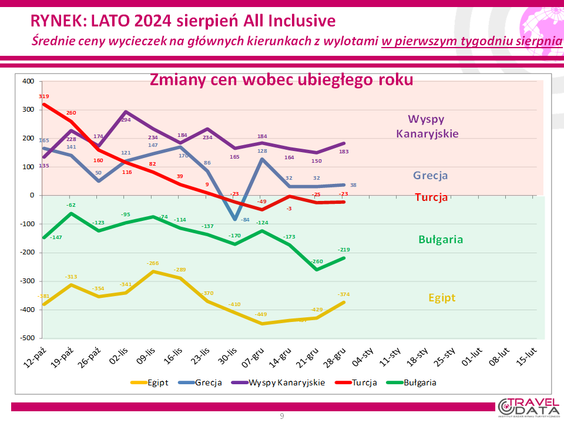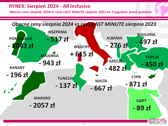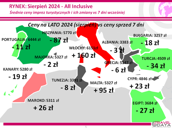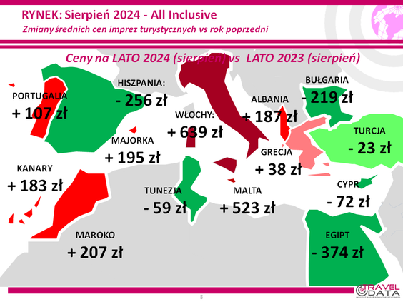 Najwięcej podrożały, licząc rok do roku, wakacje w Kalabrii – o 759 złotych i Sycylii – o 590. Największe zniżki cen wyjazdów wystąpiły w wypadku Szarm el-Szejk, o 754 złote, na Costa del Sol, o 415 złotych, i w Marsa Alam - o 279 złotych.