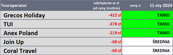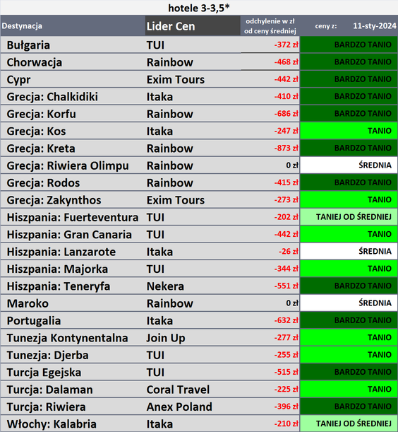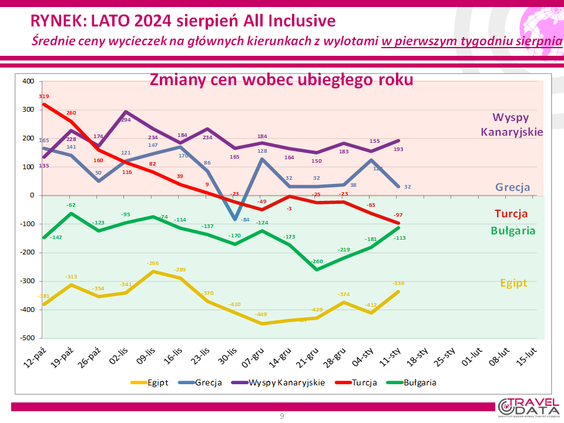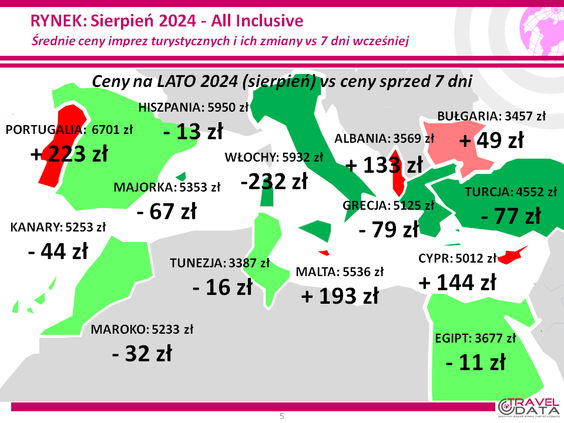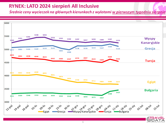 Jak pisze w najnowszym,cotygodniowym raporcie Instytut Badań Rynku Turystycznego Traveldata, w ostatnim tygodniu średnia cena wycieczki z biurem podróży z wylotem między 5 i 11 sierpnia 2024 roku spadła o 23 złote*. To nieco mniej niż połowa stawki, o którą średnia cena wzrosła tydzień wcześniej (49 złotych). Jeszcze wcześniej cena spadła o 6 złotych, przed świętami Bożego Narodzenia (notowanie z 18 grudnia) o 7 złotych i wzrosła (notowanie z 11 grudnia) o 40 złotych.