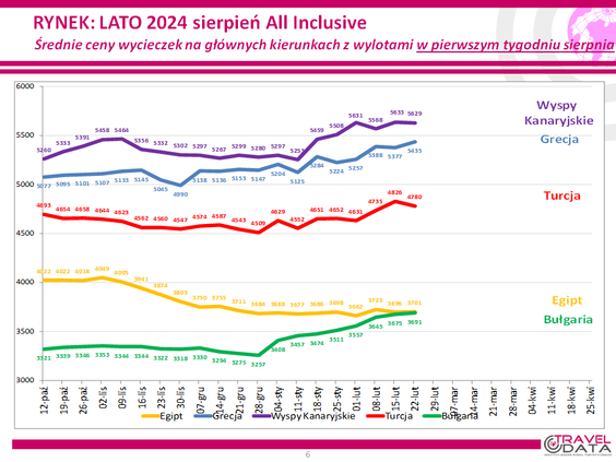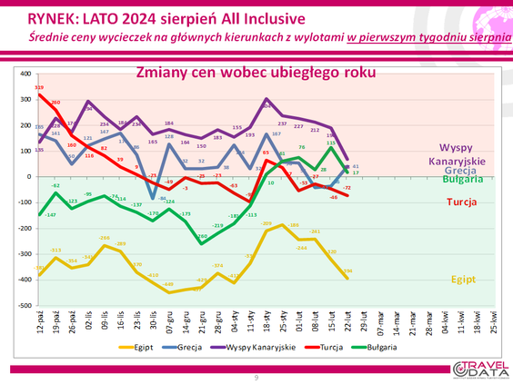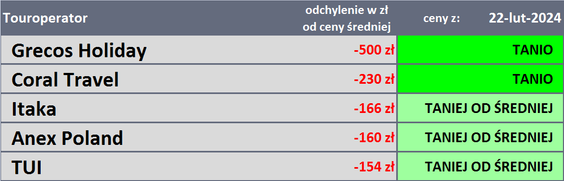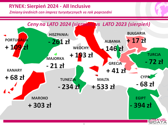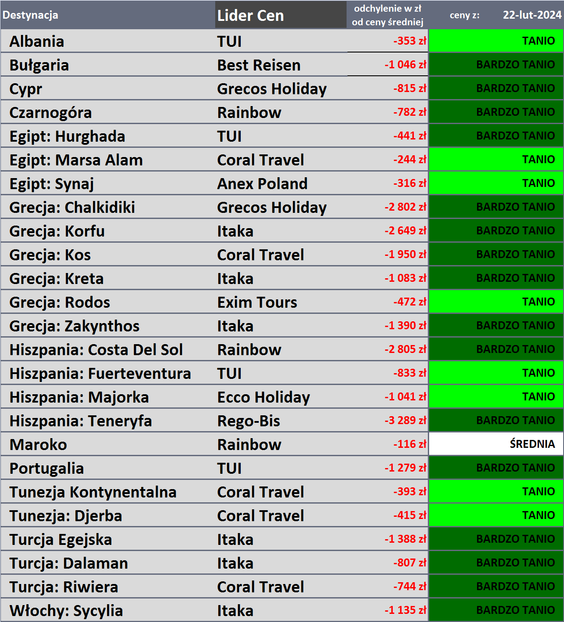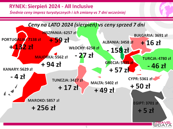 Największą zwyżkę cen w ostatnim tygodniu odnotowano w wypadku podróży wakacyjnej do Maroka – o 256 złotych. Mniejsze podwyżki objęły Portugalię, o 132 złote, i Majorkę – o 94 złote. Największe zniżki średnich cen wystąpiły z kolei w odniesieniu do Albanii, o 158 złotych, Sardynii, o 72 złote, i Turcji Egejskiej (poprzednio był tam znaczny wzrost cen) - o 65 złotych.