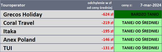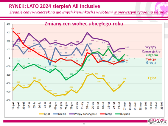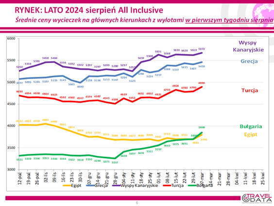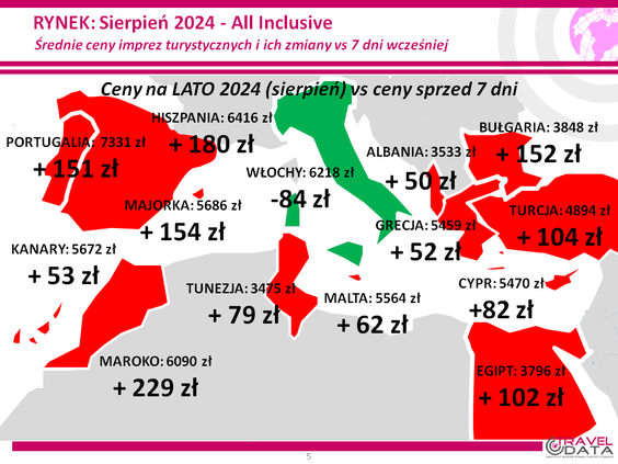 0 87 złotych wzrosła w minionym tygodniu średnia cena wycieczki w biurze podróży z wylotem między 5 a 11 sierpnia – informuje Instytut Badań Rynku Turystycznego Traveldata w najnowszym raporcie przygotowanym na podstawie analizy rynku turystyki wyjazdowej*. 87 złotych wzrostu w ciągu jednego tygodnia to bardzo dużo. Tydzień wcześniej cena spadła o 6 złotych, ale jeszcze wcześniej średnia cena wzrosła o 26, 20, 68 i o 42 złote, spadła o 3 złote, wzrosła o 93 złote, spadła o 23 złote, wzrosła o 49 złotych, spadła o 6 złotych, spadła o 7 złotych i wzrosła o 40 złotych.