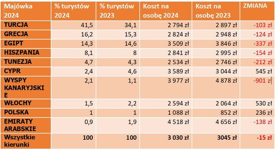 - Najpopularniejsze kierunki są o 100–200 złotych tańsze niż rok temu, choć w pierwszej dziesiątce jest kilka spektakularnych, nawet prawie 20-procentowych, obniżek kosztów majówkowego wypoczynku – przekonuje prezes Travelplanet.pl Radosław Damasiewicz. I jak wylicza, Wyspy Kanaryjskie są tańsze o 900 złotych, a Egipt o 340 złotych od osoby.