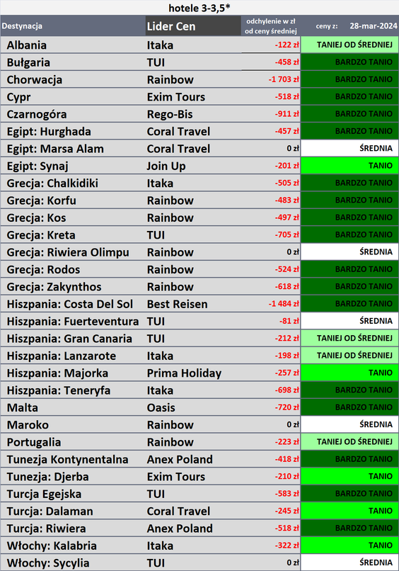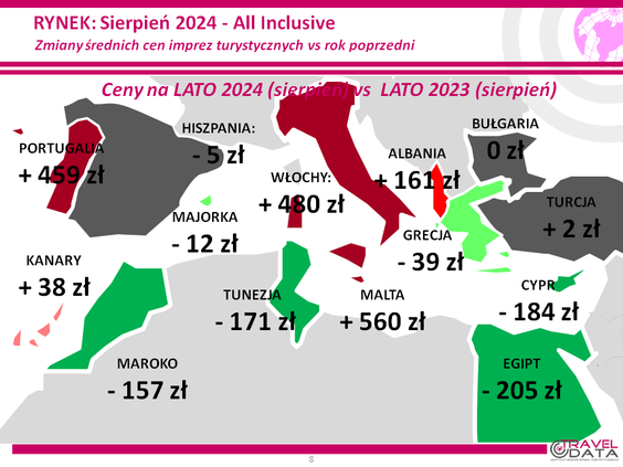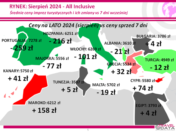 Jak podaje dalej Traveldata zdecydowanie największą zniżkę cen w ostatnim tygodniu miały wycieczki na Costa de la Luz, o 489 złotych, do Portugalii (poprzednio był tam duży wzrost cen), o 259 złotych, i do Kalabrii – o 241 złotych.