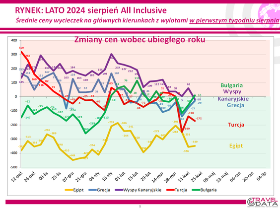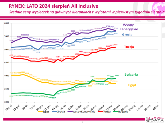 W ostatnim tygodniu średnia cena wycieczki z biurem podróży na lato 2024 wzrosła o 8 złotych – podaje w najnowszym raporcie z monitorowania ofert na rynku turystyki wyjazdowej Instytut Badań Rynku Turystycznego Traveldata*. Średnia zmiana była symboliczna i wyrażała bardziej stabilność cen. W poprzednim tygodniu cena spadła o 10 złotych, a tydzień wcześniej wzrosła o 74 złote. W jeszcze wcześniejszych tygodniach spadła o 13 złotych, wzrosła o 28, 12 i o 87 złotych, spadła o 6 złotych, wzrosła o 26, 20, 68 i o 42 złote, spadła o 3 złote i wzrosła o 93 złote.