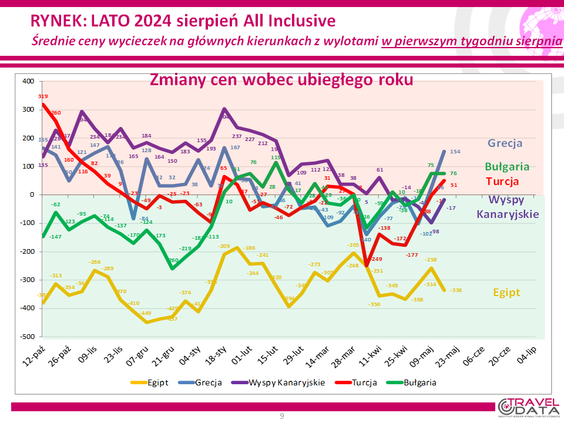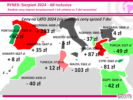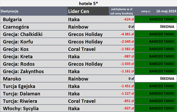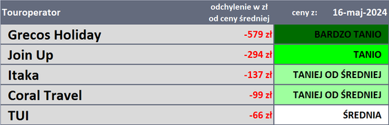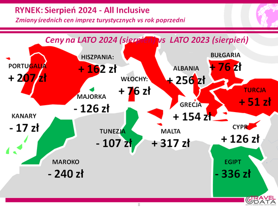 Z kolei największe zwyżki średnich cen wycieczek miały miejsce odnośnie hiszpańskiego wybrzeża Costa de la Luz, o 623 złote, a o ponad połowę mniejsze na Półwysep Chalcydycki i Zakintos - o 289 i 286 złotych.