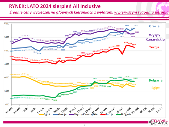 W zeszłym tygodniu średnia cena wycieczki z wylotem między 5 a 11 sierpnia, wzrosła o 13 złotych – wyjaśnia w najnowszym raporcie Instytut Badań Rynku Turystycznego Traveldata*. To podwyżka po tym, jak cena spadła tydzień wcześniej o 53 złote, a jeszcze wcześniej wzrosła o 118 złotych.