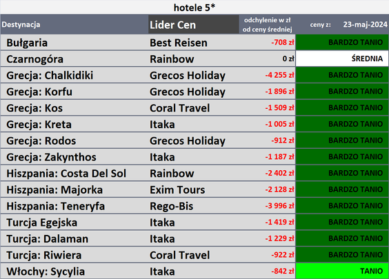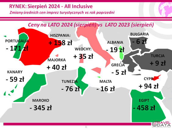 Kto chce być lepiej zorientowany, powinien przyjrzeć się zmianom cen wybranego kierunku. Jak piszą autorzy raportu, w minionym tygodniu największe zwyżki cen wycieczek objęły Costa de la Luz, a różnica w tym wypadku wyniosła 763 złote, Dżerbę ze zmianą o 203 złote i Kalabrię - o 171 złotych.
