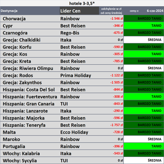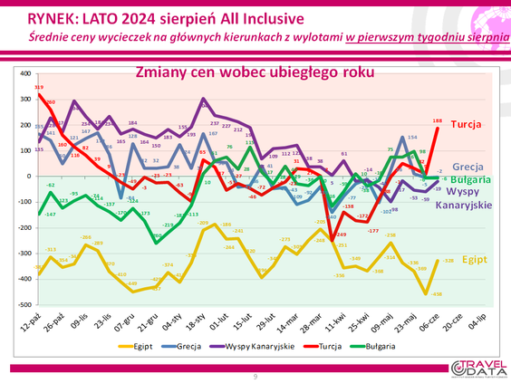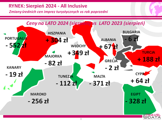 Niemniej takie stwierdzenie niewiele mówi, jeśli chodzi o sytuację poszczególnych kierunków. Tym bardziej, że jak widać na mapie zamieszczonej poniżej, wiele z nich wyróżnia mocna czerwień, co oznacza, że ceny poszły jednak zdecydowanie w górę.