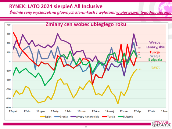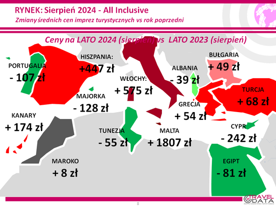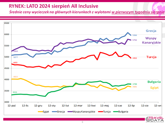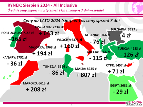 W minionym tygodniu średnia cena wycieczki z wylotem między 5 a 11 sierpnia spadła o 19 złotych – ogłosił w cotygodniowym raporcie Instytut Badań Rynku Turystycznego Traveldata*. Po ostatnich wzrostach to wręcz kosmetyczna korekta. W poprzednich tygodniach cena wzrosła o 103 złote, o 35 złotych i o 22 złote, a wcześniej spadła o 65 złotych, wzrosła o 38 złotych, wzrosła o 7 złotych, spadła o 34 złote, wzrosła o 13 złotych, spadła o 53 złote, wzrosła o 118, spadła o 58, wzrosła o 8, spadła o 10 złotych, wzrosła o 74 złote, spadła o 13 złotych, wzrosła o 28, 12 i o 87.
