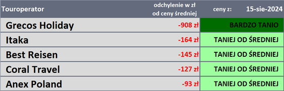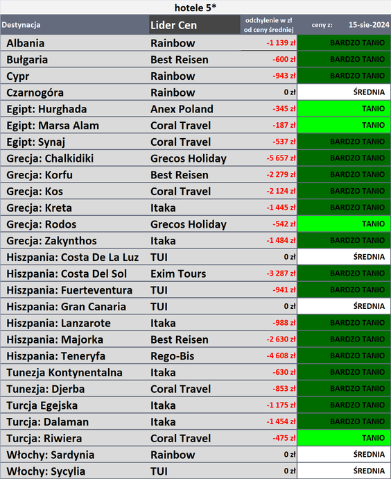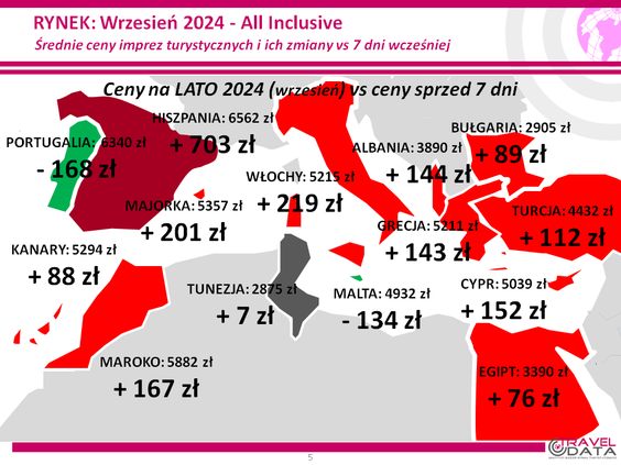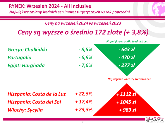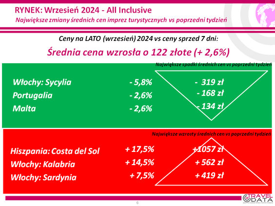Największą zwyżkę cen wycieczek Traveldata odnotowała odnośnie do Costa de la Luz - o 1112 złotych. Mniejszy wzrost miał miejsce w wypadku wyjazdów na Costa del Sol i na Sardynii – o 1045 i 983 złote. Największy spadek cen odnotowała zaś w wypadku podróży na Półwysep Chalcydycki, o 643 złote, do Portugalii , o 470 złotych, i Hurghady - o 277 złotych.