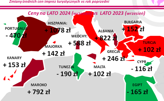 Z wiodących kierunków największy roczny wzrost średnich cen wycieczek wystąpił w Grecji - o 246 złotych, nieco mniejszy miał miejsce na Wyspach Kanaryjskich, w Bułgarii i w Turcji - o 153, 152 i 102 złote, natomiast obniżyły się ceny wyjazdów do Egiptu - o 165 złotych.