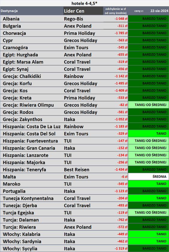 Największe zniżki średnich cen w ostatnim tygodniu zanotowano natomiast odnośnie do wyjazdów na Costa del Sol (poprzednio był tam największy wzrost cen), o 886 złotych, Korfu, o 507 złote, i Sardynii - o 182 złote.