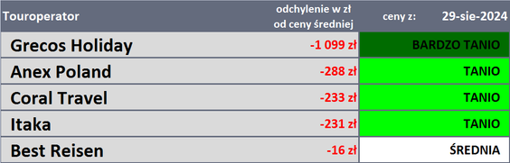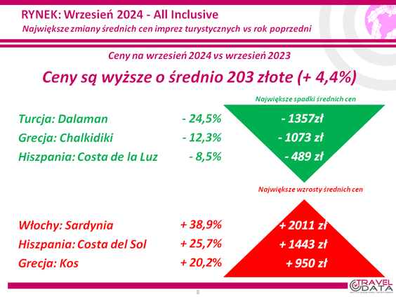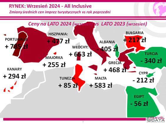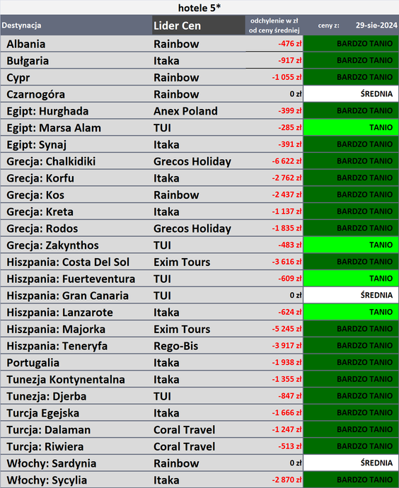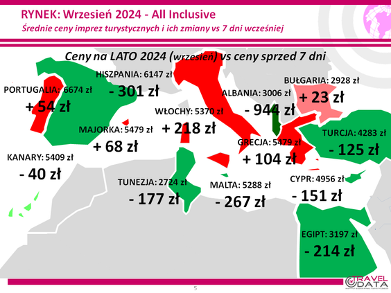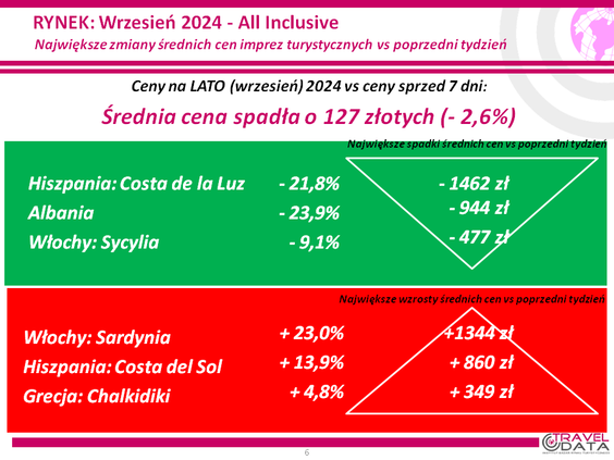 Rozrzut zmian cen był bardzo duży. Touroperatorzy najbardziej przecenili bowiem wyjazdy na Costa de la Luz (poprzednio był tam znaczny wzrost cen), o 1462 złote, do Albanii, o 944 złotych, i na Sycylię - o 477 złote.