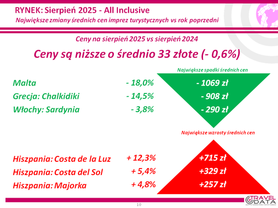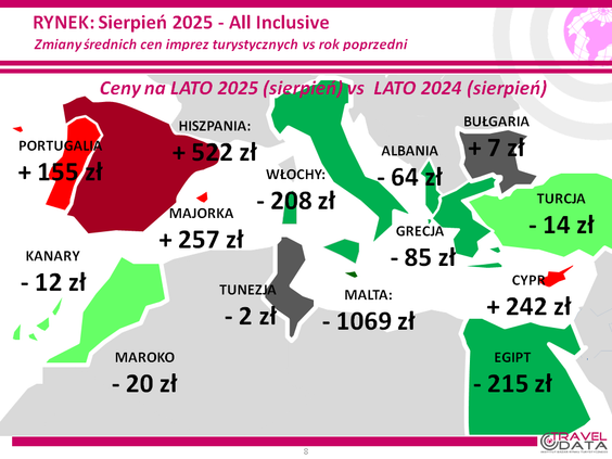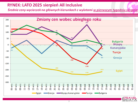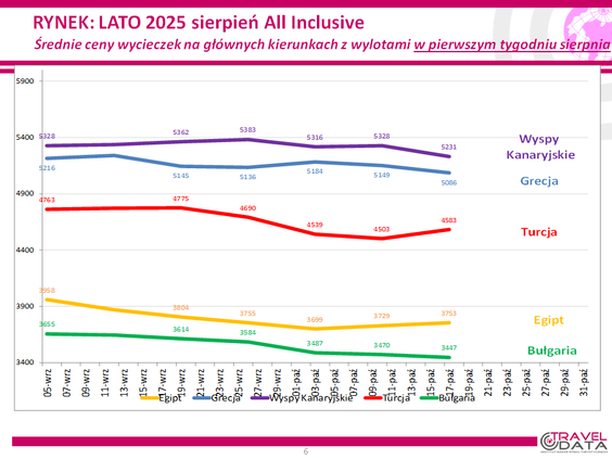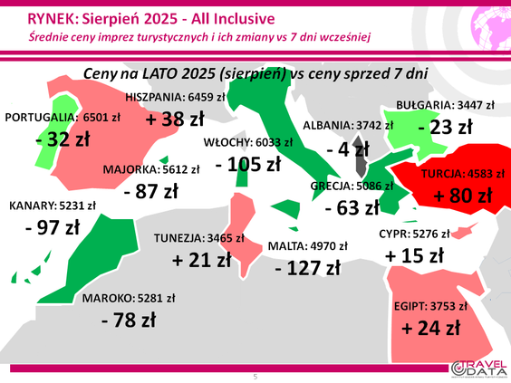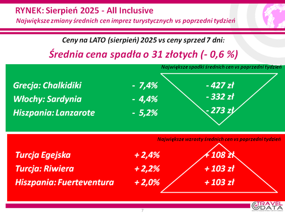 Zmiany średnich cen w ostatnim tygodniu Traveldata ilustruje grafikami.