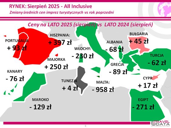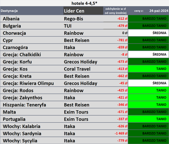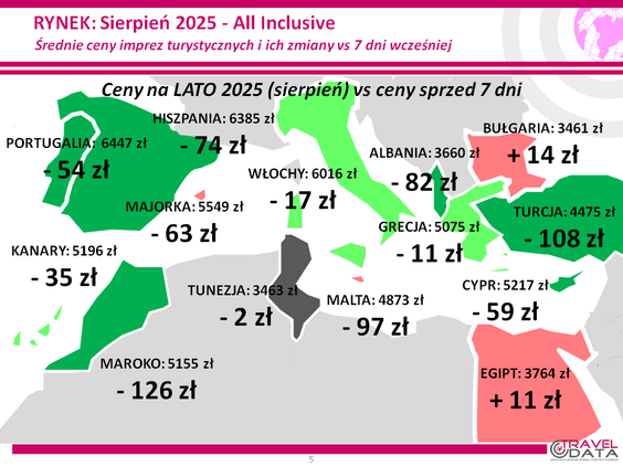 Najwięcej najtańszych wyjazdów do Egiptu miały TUI Polad (5 ofert), Coral Travel i Anex Tour (po 3), do Grecji Rainbow (11), Itaka, Grecos, Best Reisen i TUI Poland (wszystkie po 4), na Wyspy Kanaryjskie TUI Poland (11) i Itaka (5), do Turcji Rainbow (6), Itaka i Anex Tour (po 4), do Tunezji Anex Tour (5) i Rainbow (3), do Bułgarii TUI Poland (3) i Best Reisen (2 oferty) – wyliczają eksperci z Traveldaty.
