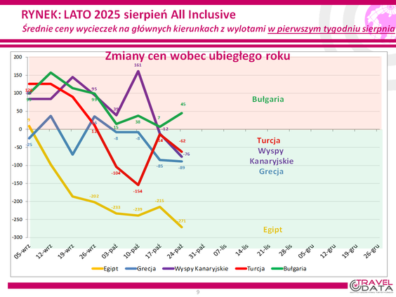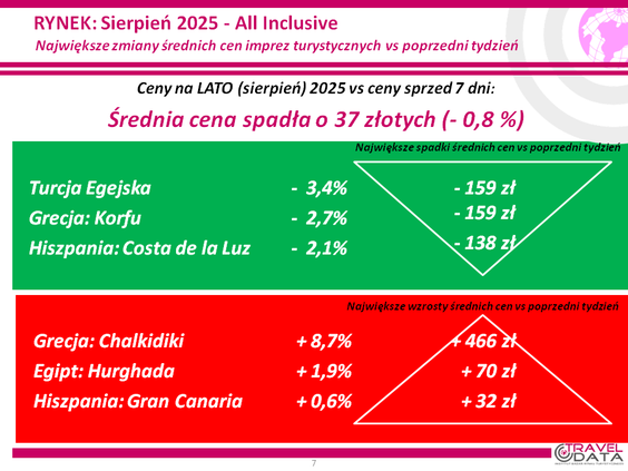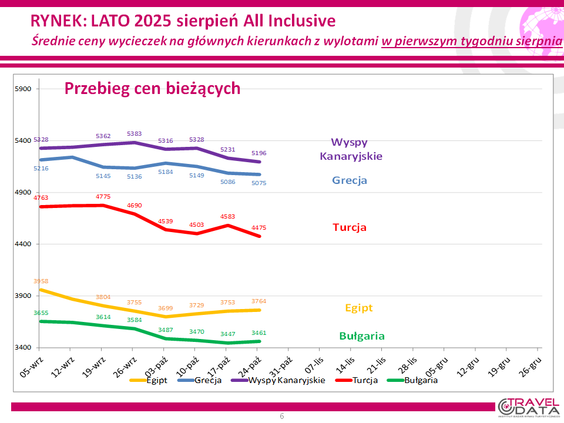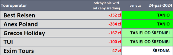 W kolejnej części analizy jej autorzy zamieszczają tabelę z biurami podróży, które oferowały w ostatnim tygodniu imprezy turystyczne po przekrojowo najkorzystniejszych cenach. Jak piszą, w ósmym w tym sezonie letnim zestawieniu nie nastąpiły żadne zmiany w zakresie składu i kolejności zajmowanych przez touroperatorów miejsc. „Sytuacja taka miała miejsce już trzeci raz w sezonie lato 2025”. Na czele zestawienia pozostawał Best Reisen, a kolejne pozycje zajmowały biura Anex Tour i Grecos.