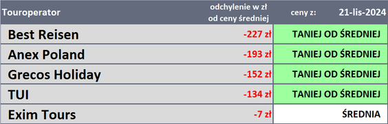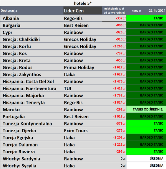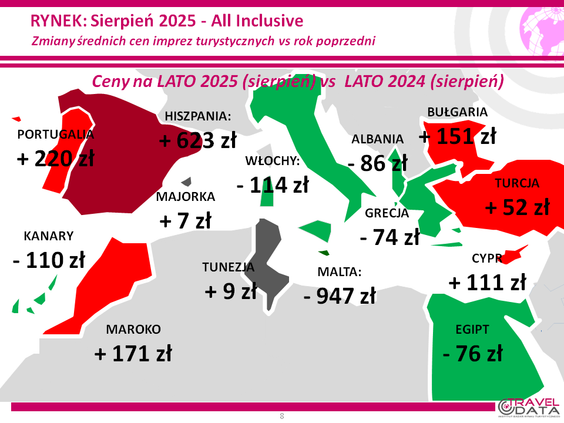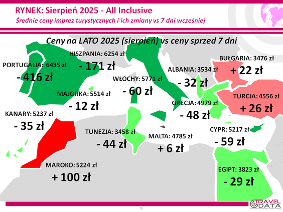 Jak pisze Traveldata, największe zniżki cen w ostatnim tygodniu odnotowano w wypadku Portugalii i na hiszpańskim wybrzeżu Costa de la Luz (poprzednio miał tam miejsce znaczny wzrost cen) - o 416 i 412 złotych i na greckiej wyspie Korfu - o 239 złotych. Największy wzrost średnich cen wycieczek miał miejsce na hiszpańskim wybrzeżu w Maroku - o 100 złotych, a nieco mniejsze na Teneryfie i na Krecie - o średnio 73 i 60 złotych.