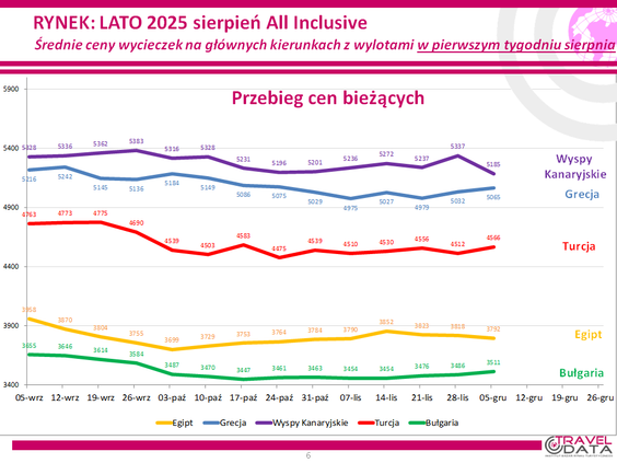 W minionym tygodniu średnia cena wycieczki z wylotem między 4 a 10 sierpnia 2025 roku spadła o 17 złote – podaje Instytut Badań Rynku Turystycznego Traveldata w najnowszym, cotygodniowym raporcie z monitorowania cen w biurach podróży. Zmiana o 17 złotych nie ma większego znaczenia, można uznać, że ceny praktycznie nie drgnęły.
