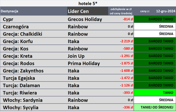 Z kolei największy wzrost średnich cen objął wyjazdy na Półwysep Chalcydycki i chodziło o 1163 złote, na Sardynię, ze zmianą o 314 złotych, i na Teneryfę - o 199 złotych.