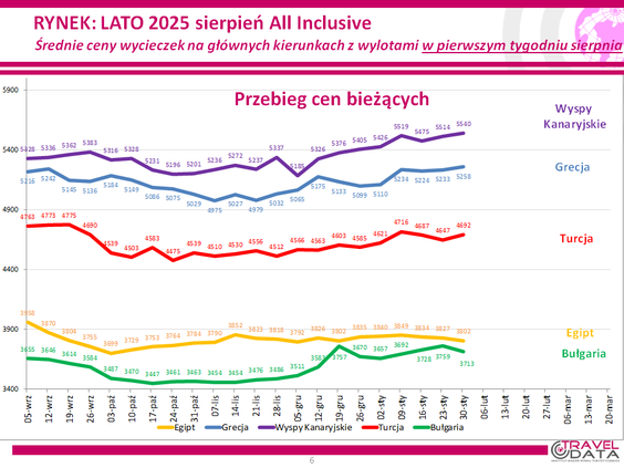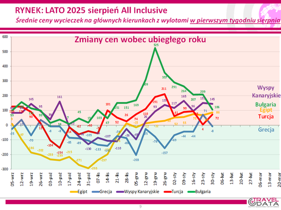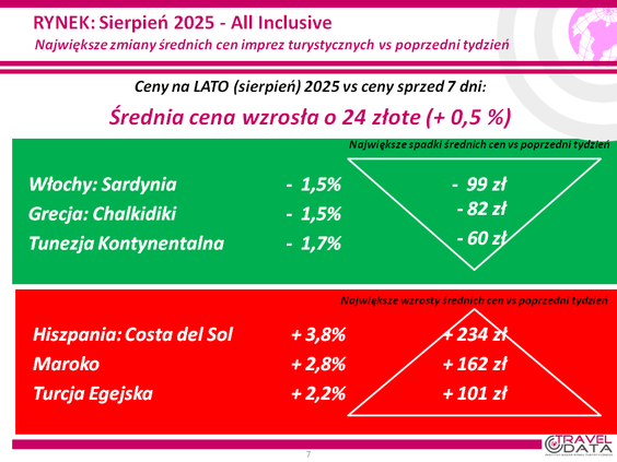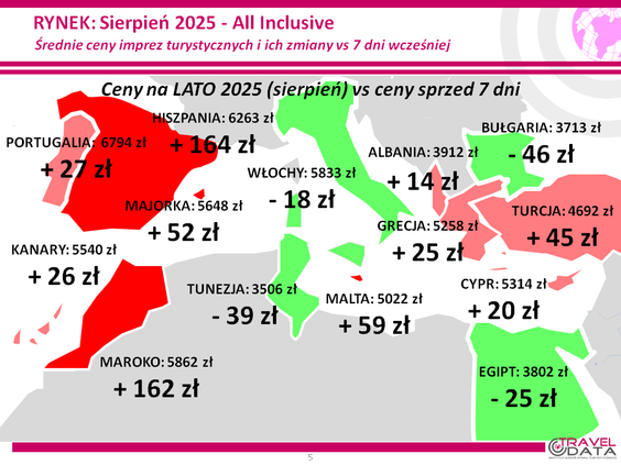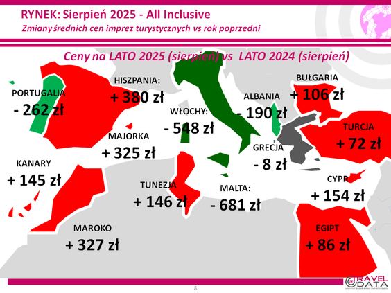 Z raportu Traveldaty dowiadujemy się, że największą podwyżkę średniej ceny zaobserwowała ona na wyjazdy na hiszpańskie wybrzeże Costa de la Luz (poprzednio ceny spadły tam najbardziej), o 234 złote, a także do Maroka i Turcji Egejskiej - o 162 i 101 złotych.