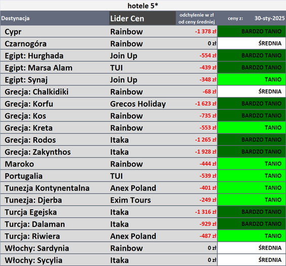 Największą zniżkę w ostatnim tygodniu odnotowała za to w wypadku wakacji na Sardynii (poprzednio był tam największy wzrost cen) - o 99 złotych. Niewiele mniejszy spadek objął Półwysep Chalcydycki i Tunezję - o 82 i 60 złotych.