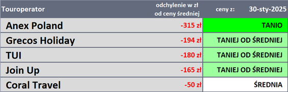 Niewielka to zmiana, tyle że wcześniej cena też wzrosła o 9 złotych, a jeszcze wcześniej spadła o 21 złotych, wzrosła o 75, 16 i 18 złotych, spadła o 8, wzrosła o 63 złote, spadła o 17 i o 35 złotych, wzrosła o 44 złote, spadała o 17, 6, 37, 31, 15, 59, 49, 83, 10 i 32 złote. Widać z tego, że po serii spadków, teraz raczej cena ma tendencję do rośnięcia. Prawdopodobnie to efekt znikania wycieczek w półek ich organizatorów, i mijania kolejnych etapów promocji, jakie wdrażają w pierwszych miesiącach sprzedaży, ale później wygaszają.