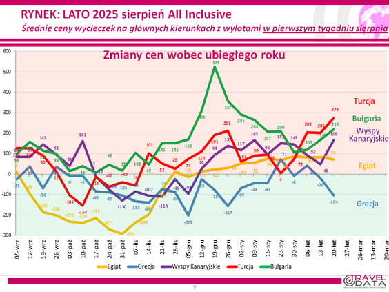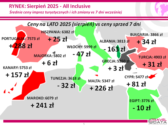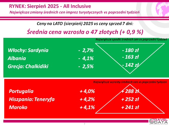 W minionym tygodniu średnia cena wycieczki z biurem podróży z wylotem między 4 a 10 sierpnia wzrosła o 47 złotych – donosi w najnowszym raporcie z monitorowania ofert Instytut Badań Rynku Turystycznego Traveldata*. Jeśli tę kwotę doliczyć do zwyżek z poprzednich czterech tygodni, to okaże się, że średnia cena wzrosła w tym czasie o 184 złote.