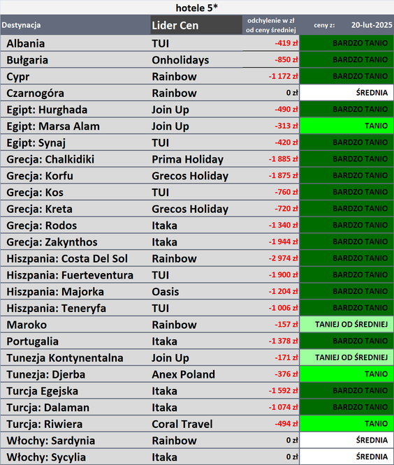 Największą zniżkę cen w ostatnim tygodniu Traveldata odnotowała odnośnie do podróży na Sardynię - o 180 złotych, do Albanii, o 163złote, i na Półwysep Chalcydycki (poprzednio miał tam miejsce znaczący wzrost cen) – o 142 złote.