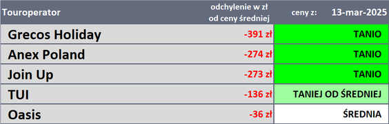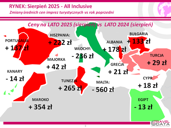 Autorzy raportu wyjaśniają dalej, że najwięcej w ostatnim tygodniu spadły ceny wakacji na Sardynii, o 183 złote, na Teneryfie, o 139 złotych, i Sycylii - o 129 złotych. A najbardziej zdrożały te na Półwyspie Chalcydyckim, o 159 złotych, w Maroku, o 86 złotych, i na Kos - o 75 złotych.