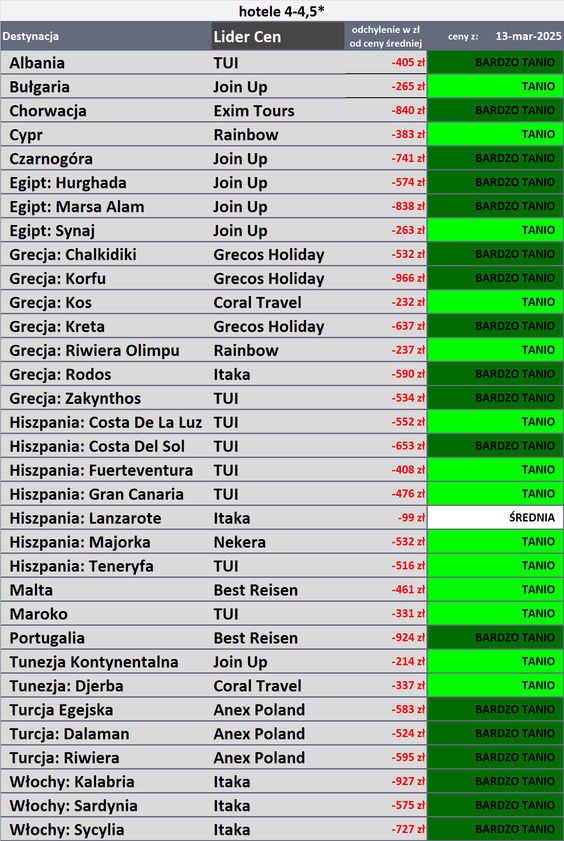 W ostatnim tygodniu eksperci z Traveldaty największe zniżki cen odnotowali w wypadku wyjazdów na Sardynię (ponownie), o 636 złote, do Kalabrii, o 279 złotych, i na Półwyspie Chalcydyckim (poprzednio był tam duży wzrost cen) – o 161 złotych.