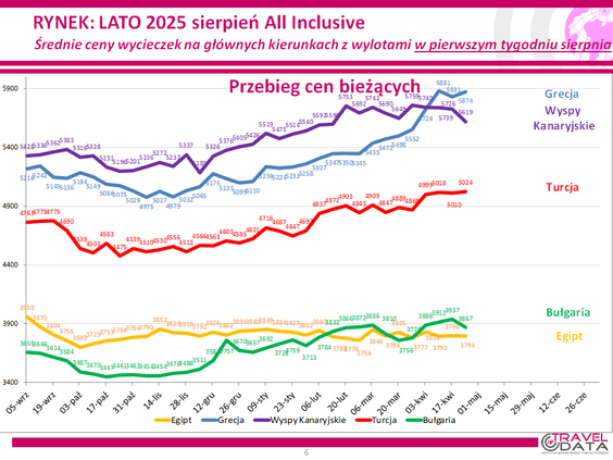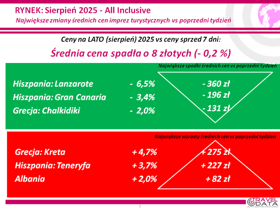 Nieznaczna zmiana ceny wycieczki z biurem podróży – w minionym tygodniu za wyjazd z wylotem między 4 a 10 sierpnia trzeba było zapłacić o 8 złotych mniej niż tydzień wcześniej – podaje Instytut Badań Rynku Turystycznego Traveldata w najnowszym omówieniu wniosków z monitorowania cen największych touroperatorów*.