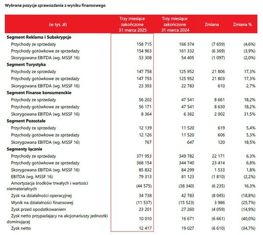 W pierwszym kwartale skorygowana EBITDA wyniosła 85,8 miliona złotych i utrzymała się na poziomie nieco wyższym niż w 2024 roku – podaje Wirtualna Polska Holding w komunikacie. Zysk netto wyniósł 12,4 miliona złotych.