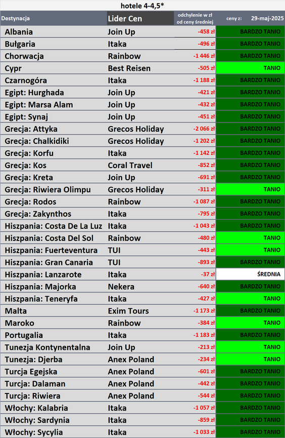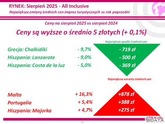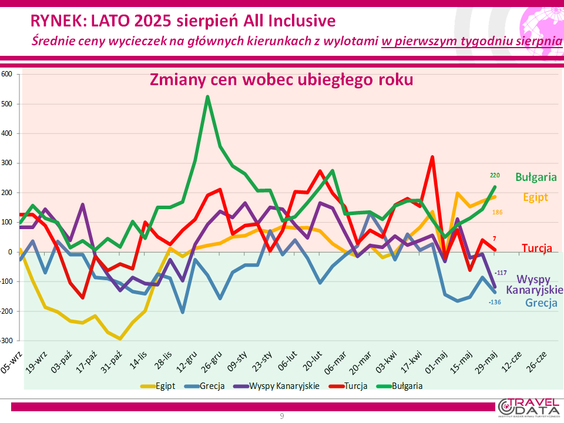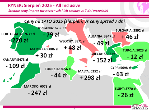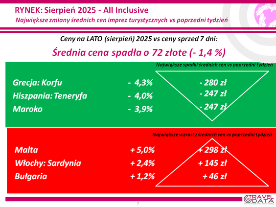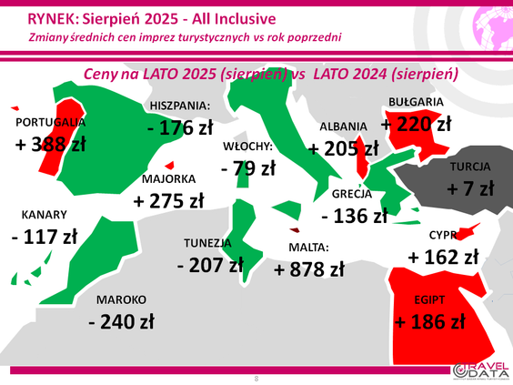Największy wzrost z kolei objął wakacje na Malcie - o 298 złotych, na Sardynii (poprzednio był tam znaczny spadek cen) – o 145 złotych, i w Bułgarii - o 46 złotych.