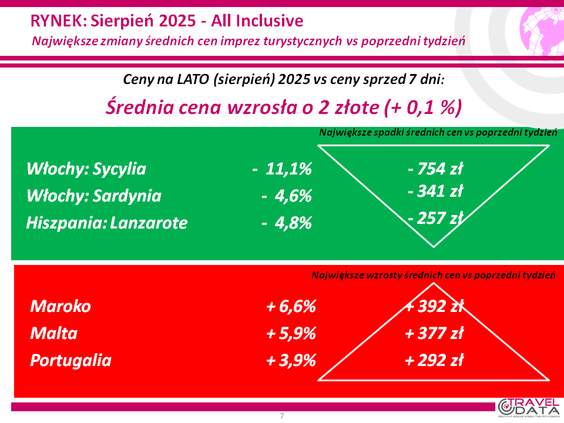 Jeśli zaś chodzi o ostatni tydzień, to największą zniżkę cen Traveldata odnotowała w wypadku wyjazdów na Sycylię, o 754 złote, na Sardynię, o 341 złote, i na Lanzarote - o 257 złotych. Największy wzrost średniej ceny miały z kolei miejsce odnośnie do wycieczek do Maroka, o 392 złote, na Maltę, o 377 złotych, i do Portugalii - o 292 złote.