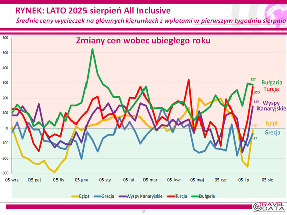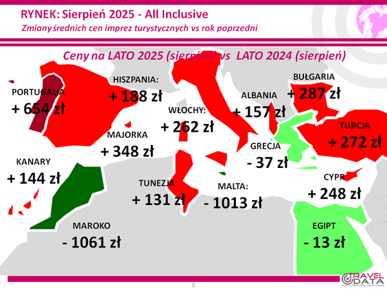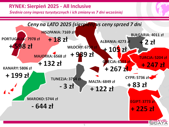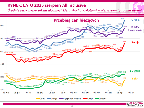 O 190 złotych wzrosła w ciągu tygodnia średnia cena wakacji nad ciepłym morzem – podaje w najnowszym raporcie z monitorowania ofert biur podróży Instytut Badań Rynku Turystycznego Travelata*. Odkąd trwa sprzedaż sezonu lato 2025, czyli od końca lata zeszłego roku, takiego skoku cen jeszcze nie było.