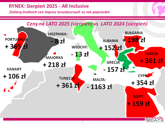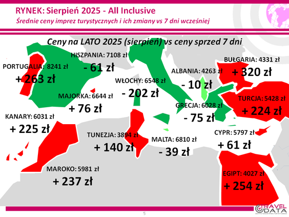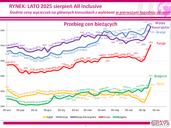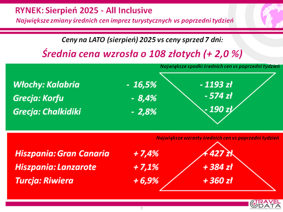 Do szczytu sezonu letniego, za który uznać można pierwszy tydzień sierpnia, został już tylko tydzień, kiedy eksperci Instytutu Badań Rynku Turystycznego Traveldata porównali ceny wyjazdów organizowanych przez biura podróży. Okazało się, że średnia cena wycieczki z wylotem między 4 a 10 sierpnia wzrosła o 108 złotych*.