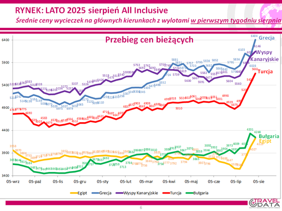 W minionym tygodniu, średnia cena wycieczki z biurem podróży z wylotem między 4 a 10 sierpnia wzrosła o 74 złote – informuje Instytut Badań Rynku Turystycznego Traveldata. To już ostatni z serii raportów dotyczących pierwszego pełnego tygodnia sierpnia, wziętego jako przykład szczytu sezonu letniego*. Kolejny raport będzie dotyczył prawdopodobnie jednego z tygodni września lub października.