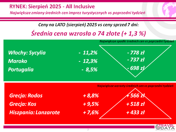 Wracając do ostatniego tygodnia – największy wzrost średnich cen wycieczek miał miejsce w wypadku ofert wakacji na Rodos, o 566 złotych, na Kos i na Lanzarote – o 518 i 433 złote.
