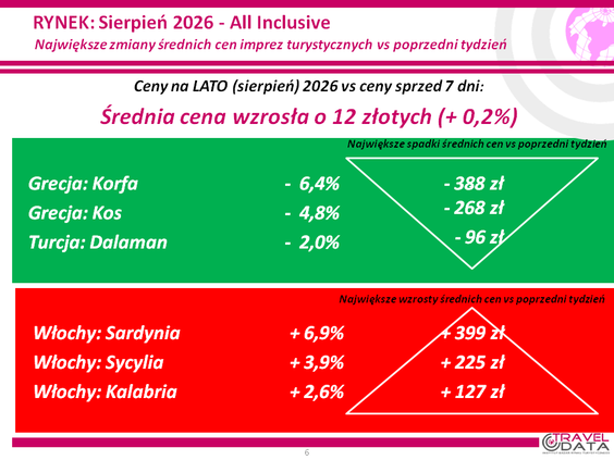 W minionym tygodniu średnia cena wycieczki z biurem podróży z wylotem między 3 a 9 sierpnia 2026 roku wzrosła o 12 złotych – donosi w najnowszym raporcie Instytut Badań Rynku Turystycznego Traveldata*, która analizuje co tydzień tysiące ofert.