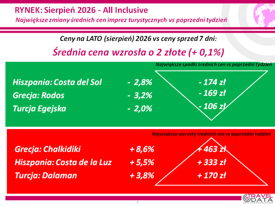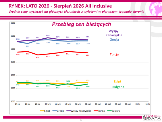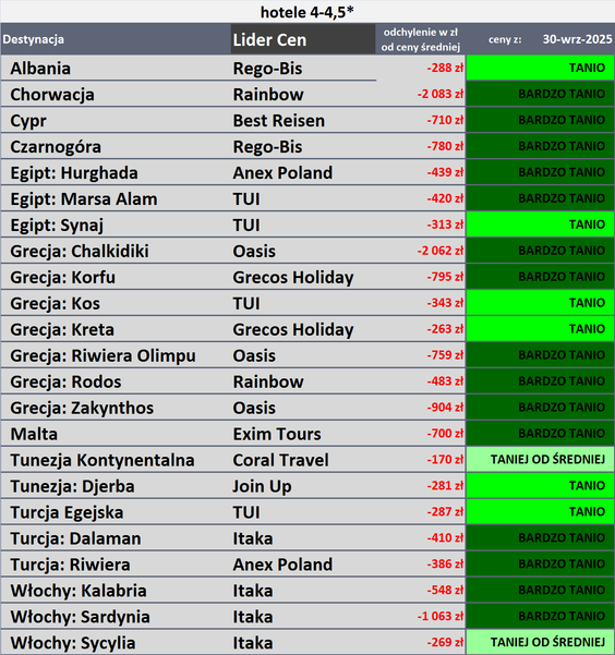 Przed ostatnią tabelą wyjaśniają, o co w niej chodzi: „Ponieważ szczegółowo badamy kierunki wyjazdów i hotele, które najczęściej są oferowane przez organizatorów, poniżej przedstawiamy zestawienia »liderów cen« (z badanego tygodnia) na niektórych kierunkach wybieranych przez klientów biur podróży z podziałem na wyjazdy do hoteli 3-gwiazdkowych, 4-gwiazdkowych i 5-gwiazdkowych. Liderami cen są organizatorzy, którzy oferują wyjazdy (w tym wypadku siedmiodniowe, all inclusive, z wylotem z Warszawy na pierwszy tydzień sierpnia 2026 roku) z najatrakcyjniejszymi dla klientów średnimi cenami oferowanych imprez turystycznych (czyli których średnia oferowana cena jest najniższa względem średniej ceny wyjazdów do hoteli danej kategorii gwiazdkowej na danym kierunku)”.