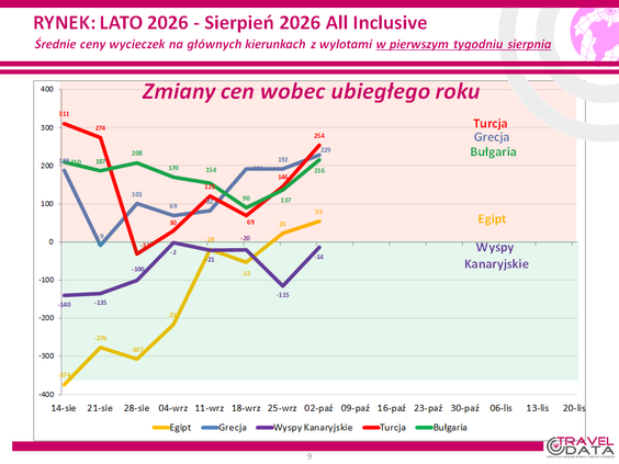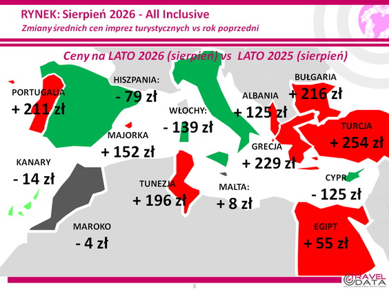 *Opracowanie obejmuje porównanie cen wyjazdów z wylotem w wysokim sezonie letnim 2026 roku, definiowanym na potrzeby porównań jako okres pierwszego tygodnia sierpnia, czyli od 3 do 9 sierpnia. Ceny dla tego okresu zostały zebrane 30 września 2025 roku i porównane z cenami dla tego samego okresu wylotów zebranymi 23 września 2025 roku – w ujęciu tydzień do tygodnia – oraz z cenami zebranymi 3 października 2024 roku w ujęciu rok do roku.