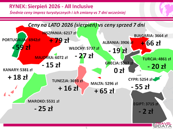 W porównaniu z okresem sprzed roku biuro TUI Poland poprawiło pozycję w Egipcie, Grecji i w Turcji, biuro Itaka w Turcji, a biuro Rainbow na Wyspach Kanaryjskich – podsumowują eksperci z Traveldaty.