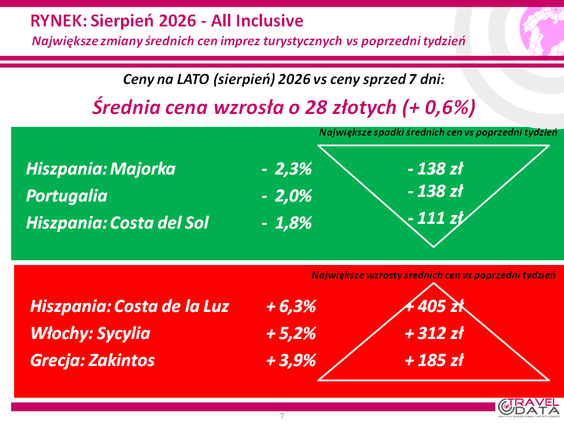 O 28 złotych wzrosła w minionym tygodniu średnia cena wycieczki z wylotem między 3 a 9 sierpnia przyszłego roku. Informuje o tym w najnowszym raporcie Instytut Badań Rynku Turystycznego Traveldata*, który śledzi ceny ofert w dużych i średnich biurach podróży.