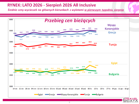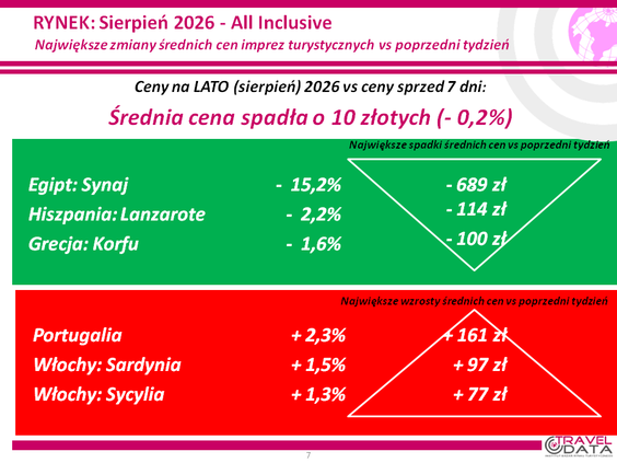 W minionym tygodniu średnia cena wycieczki z wylotem między 3 a 9 sierpnia 2026 roku spadła o 10 złotych – podaje w najnowszym, cotygodniowym podsumowaniu wyników obserwowania rynku biur podróży Instytut Badań Rynku Turystycznego Traveldata*.